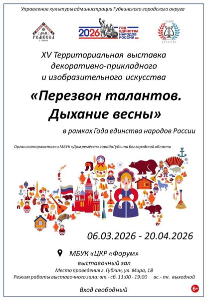 XV Территориальная выставка декоративно-прикладного и изобразительного искусства «Перезвон талантов. Дыхание весны» с 6 марта по 20 апреля 2026 года