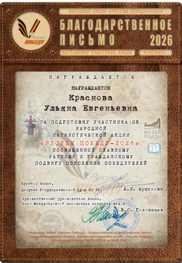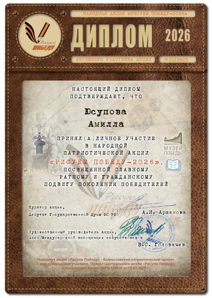 Учащаяся студии ДПТ "Обережек" Юсупова Амила, руководитель Краснова Ульяна Евгеньевна, приняла участие в народной патриотической акции "Рисуем Победу - 2026", посвященной славному ратному и гражданскому подвигу поколения победителей.